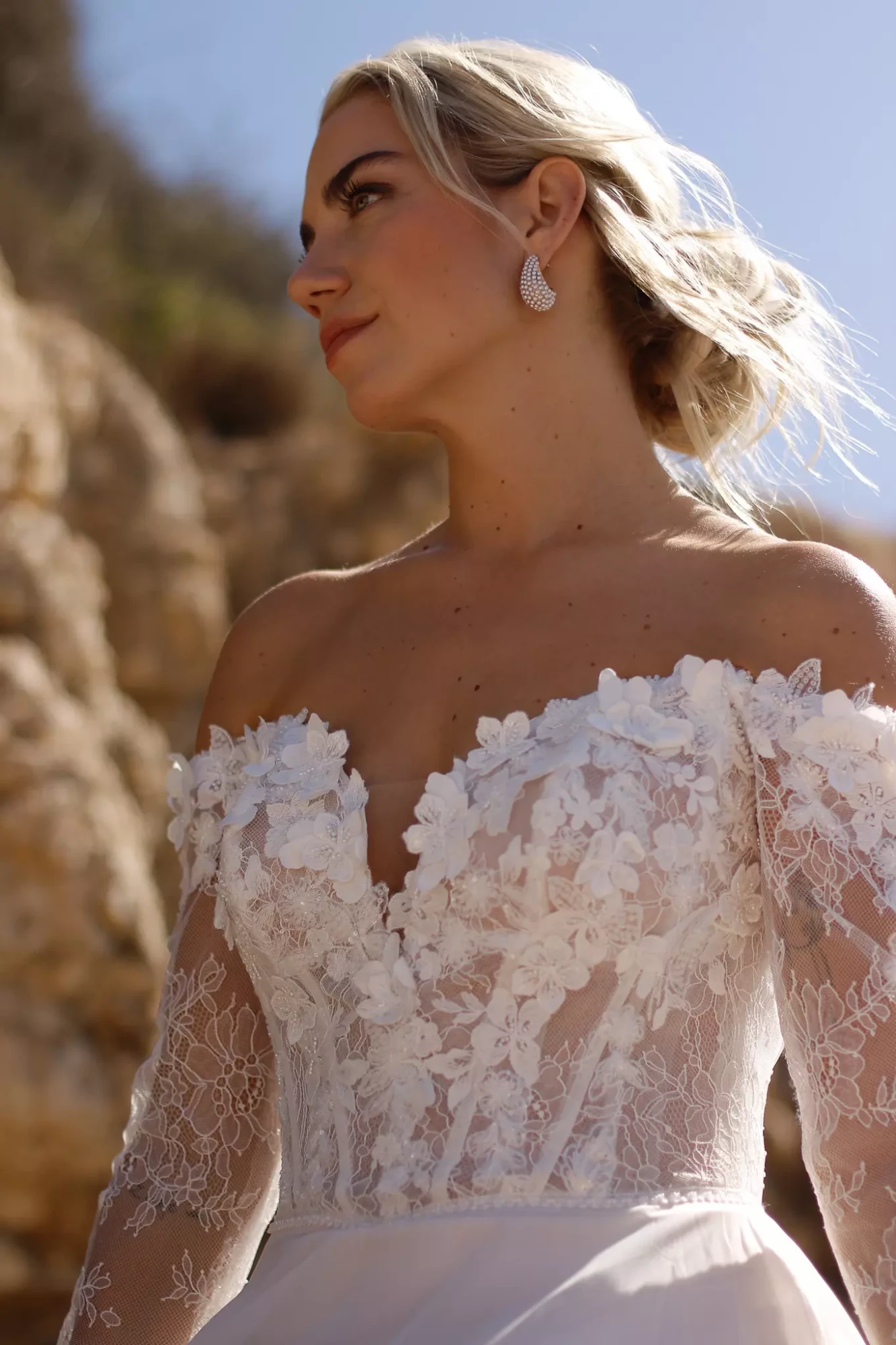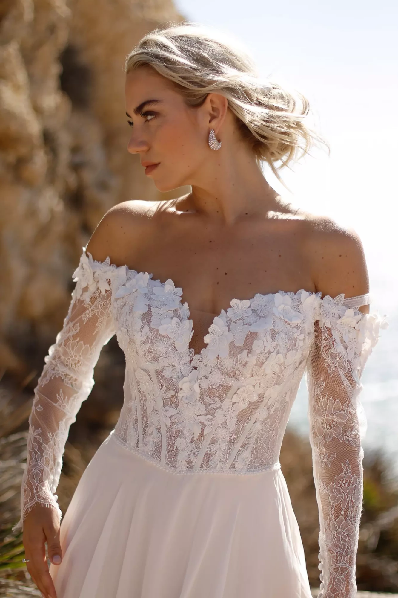 BR26110 kombiniert klassische Eleganz mit moderner Boho-Romantik. Das Korsett-Oberteil beeindruckt mit einem herzförmigen Ausschnitt, der von zeitgenössischen 3D-Applikationen veredelt wird, welche sich bis in den Rücken ziehen. Eine dezente Romantik entsteht durch die langen, schulterfreien Ärmel aus durchgehender Spitze – perfekt für Bräute, die einen Hauch Nostalgie mit zeitgemäßem Schnitt wünschen. Der Rock aus feinem Chiffon sorgt für fließende Bewegungen und eine dramatische, luftige Silhouette.