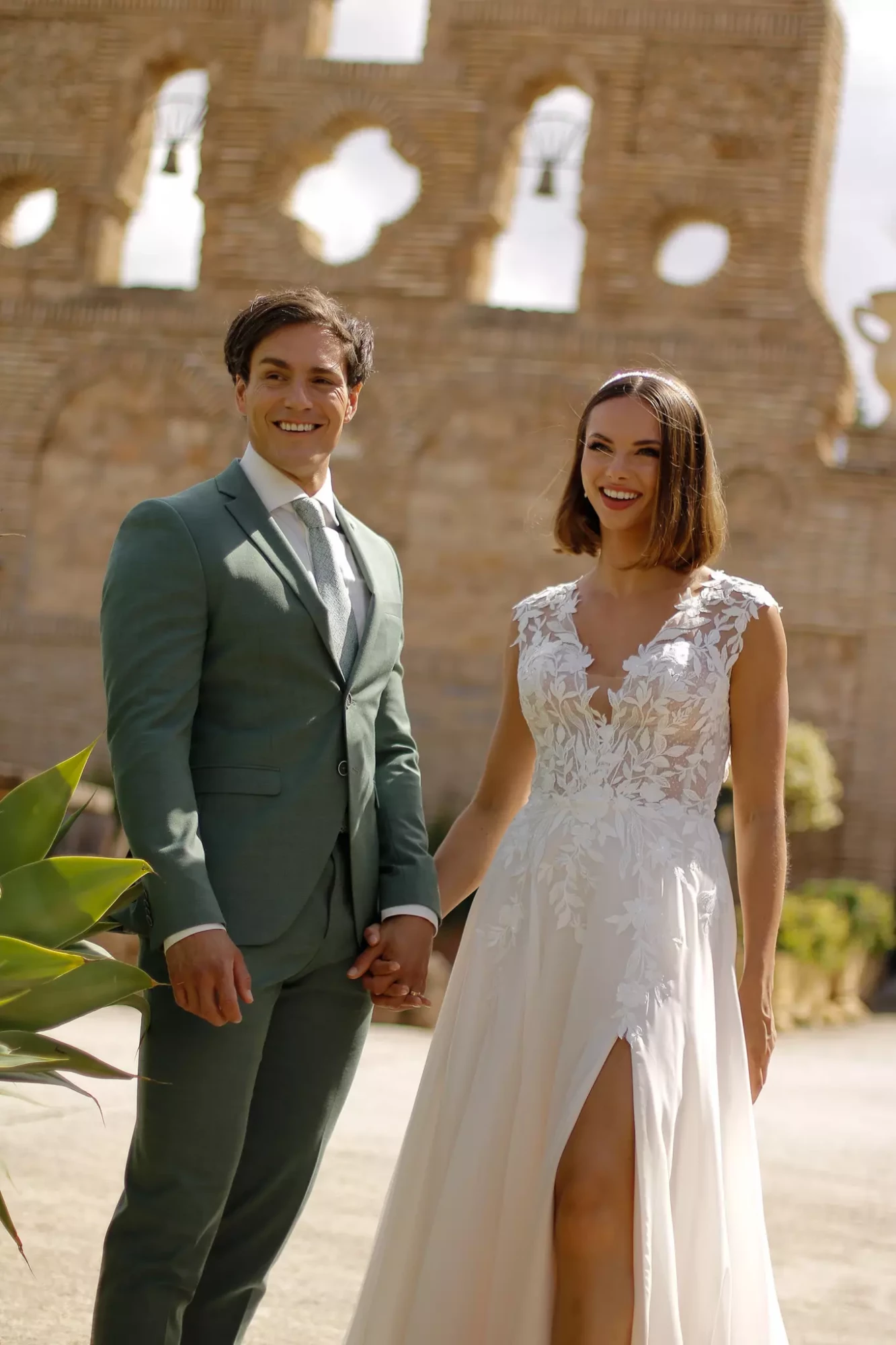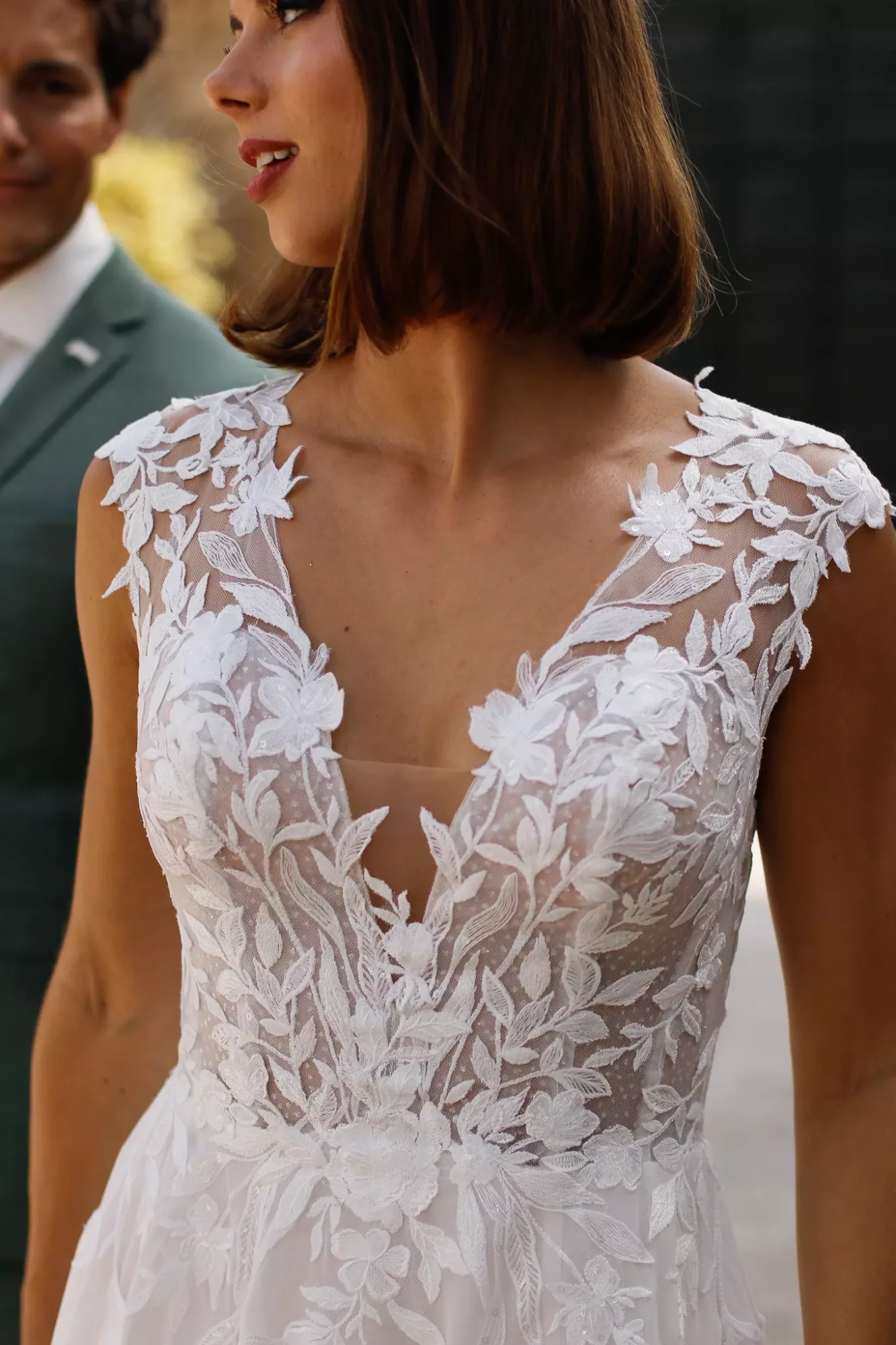 Dieses Brautkleid aus der Made to Love-Kollektion von Très Chic kombiniert klassische Eleganz mit modernen Akzenten. Das Korsett-Oberteil mit tiefem V-Ausschnitt ist kunstvoll mit Spitzenapplikationen und schimmernden Perlen verziert, die sanft über die Taille nach unten verlaufen. Ein raffiniertes Schlüssellochdetail im Rücken verleiht dem Kleid eine zusätzliche Note von Eleganz. Der Rock aus Chiffon und Tüll fällt in einer fließenden A-Linie und ist mit einem beeindruckenden Schlitz versehen, der sowohl Bewegungsfreiheit als auch einen Hauch von Sinnlichkeit bietet.