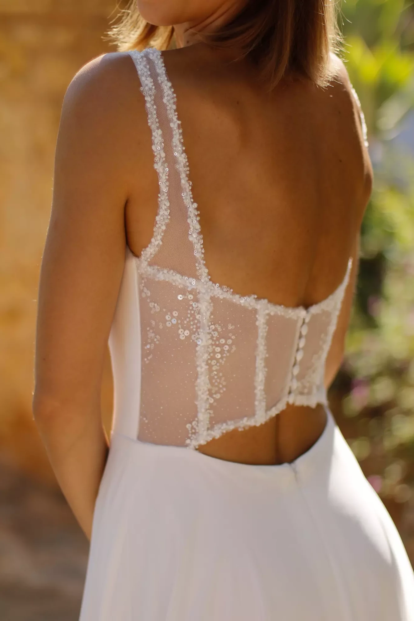 Dieses A-Linien-Kleid aus der Made to Love-Kollektion von Très Chic fällt durch elegante Raffinesse auf. Schon durch den geschmackvoll tiefen V-Ausschnitt wird eine feminine Silhouette geschaffen. Doch das eigentliche Highlight liegt im raffinierten Rückendetail: Drapierter, abnehmbarer Chiffon umspielt ein korsettartiges Oberteil aus glitzernder Spitze – eine Kombination aus glamouröser Struktur und leichter Verspieltheit.