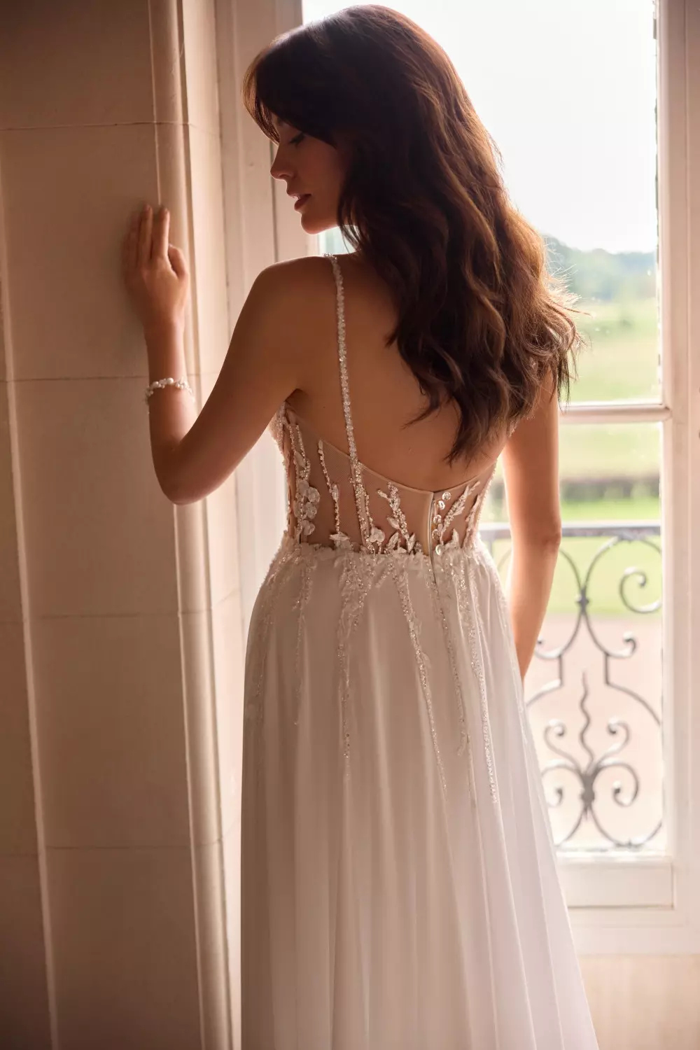 Das Brautkleid Modell 5847 von Elizabeth Passion vereint schlichte Eleganz mit modernen, sinnlichen Details. Der fließende Georgette-Rock verleiht dem Kleid eine leichte, weich schwingende Silhouette, während das Spitzenoberteil mit transparenten Einsätzen an Rücken und Seite einen raffinierten, zeitgemäßen Look erzeugt. Ein eleganter Beinschlitz sorgt für Bewegung und eine feminine Ausstrahlung, die lange Schleppe rundet das Gesamtbild majestätisch ab.