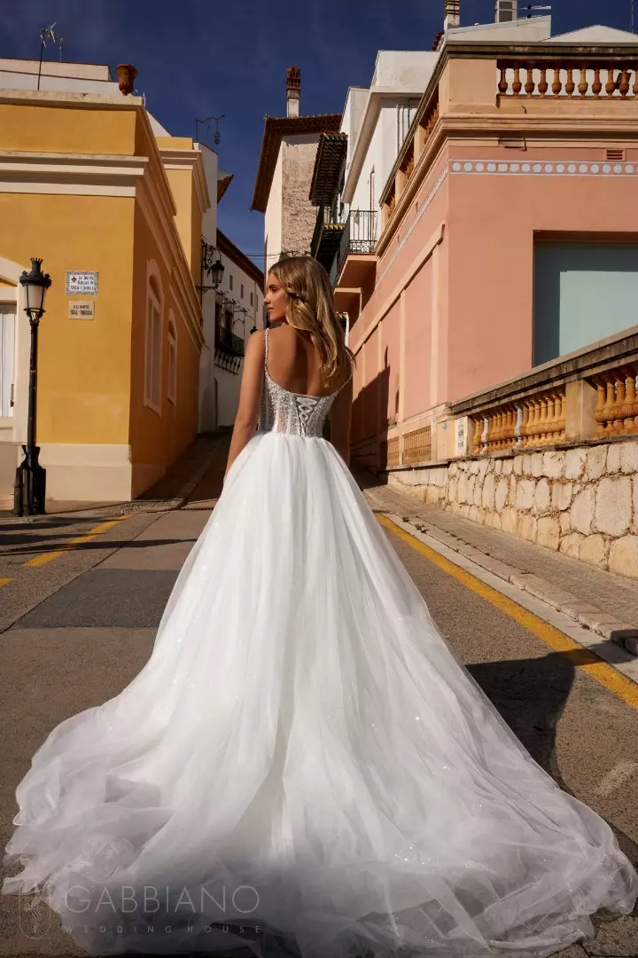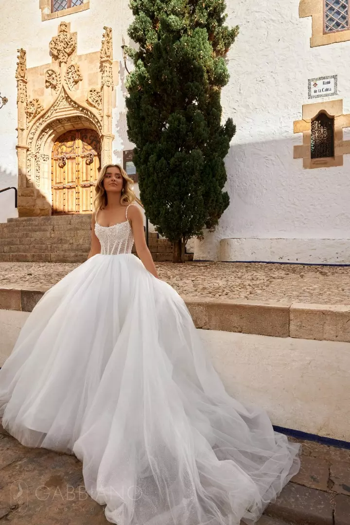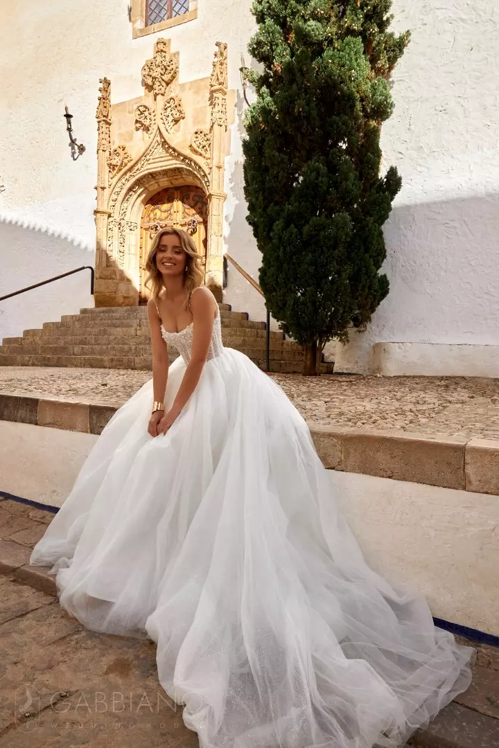 Mit Arven entfaltet sich pure Prinzessinnen-Eleganz. Das Kleid verführt mit einem kunstvoll gearbeiteten Korsett, das durch feine Stickereien und schimmernde Details zum Blickfang wird. Die off-shoulder Träger verleihen dem Oberteil eine zarte, feminine Note, während der weit ausgestellte Ballgown-Rock aus mehrlagigem Tüll eine majestätische Ausstrahlung erzeugt. Abgerundet durch eine elegante Schleppe, ist dieses Kleid wie geschaffen für Bräute, die an ihrem großen Tag glamourös erstrahlen möchten.