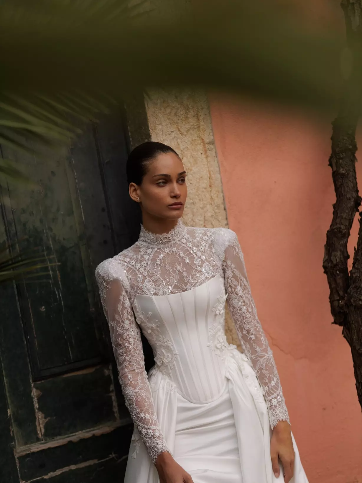 Das abnehmbare, strukturierte Korsett, verziert mit feinen Applikationen an den Seiten, formt die Taille und setzt architektonische Akzente. Ergänzt durch den sanft fallenden Überrock, der von der Taille bis zum Boden fließt und in eine elegante Schleppe übergeht, entsteht ein Look voller Dramatik und Romantik.